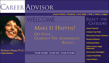 Designed by international career management expert Dr. Barbara Moses, Career Advisor combines the powerful self-assessment tools of her acclaimed Career Planning Workbook and the savvy advice of her international best-seller What Next? and the Manager’s Career Coaching Guide with today’s cutting edge e-learning technologies to create a complete electronic career management environment.